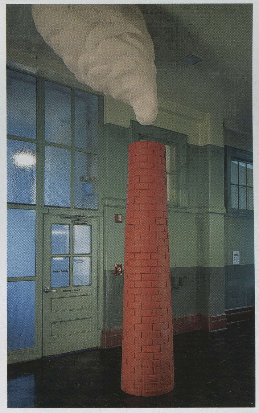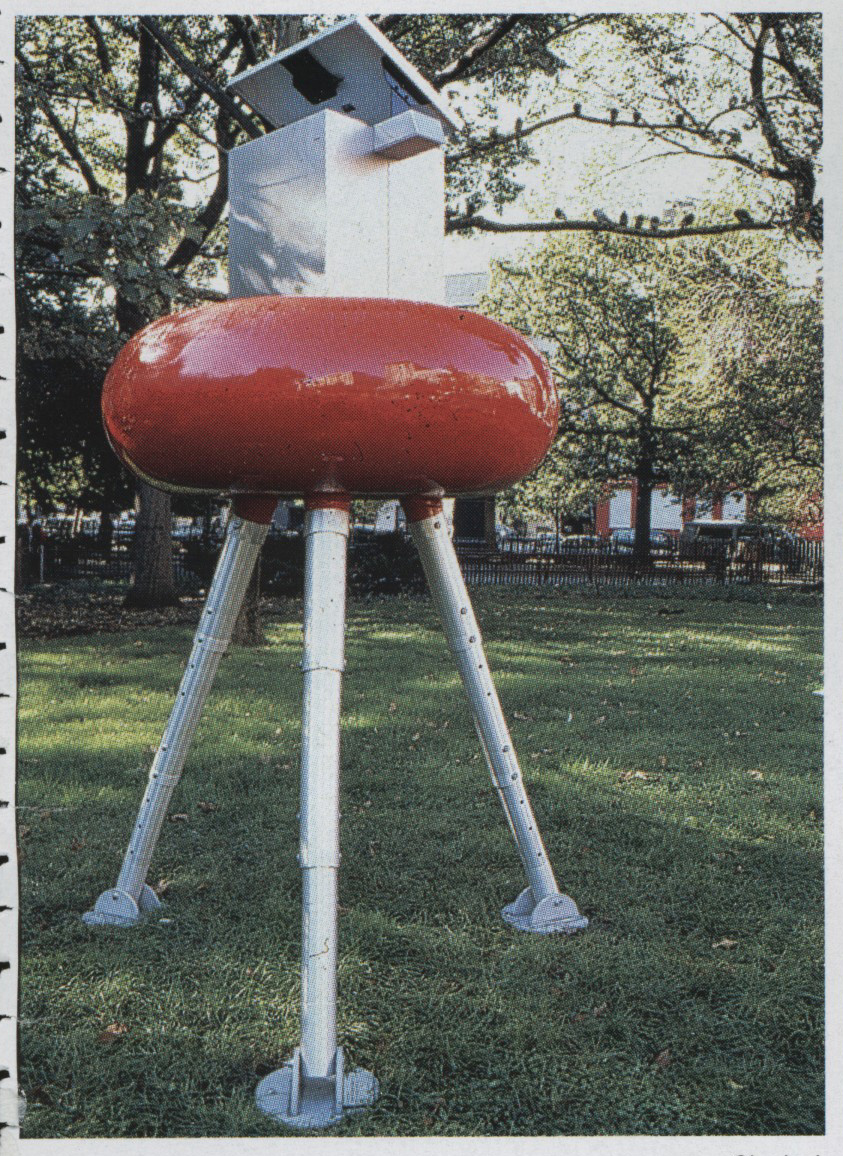 Two recent sculptural projects also explore these Issues In a three-dimensional context: Smokestacks, 2000, several large nail-polish red brick stacks the first of which was shown at P.S. l’s “Greater New York” exhibition, and E.S.U.S. (Extremely Site-unspecific sculptural), 2000, an unlikely cross between an Ed Wood-worthy UFO and a Weber grill, shown at the Whitney Museum of American Art at Phillip Morris, Stockholm’s Royal Academy of Fine Arts, Tompkins Square Park, and elsewhere, remand us just how paradoxically universal the Idea of site-specificity has become and how it blends itself to the Inherently fantastic—dare I say cartoonish?—nature of art that Pop placed front and center. Both works are quite literally parasites, eating away at the attempt to liberalize space and place in notions such as objecthood and site-specificity. More seriously, perhaps, both works attempt to come to terms with an idea that Minimalism and Conceptualism found difficult to tolerate, the idea that art may not have much of a place at all—that it’s neither a “specific objects,” nor a specific site—and that, just perhaps, this is the source of both its weakness and its strength.