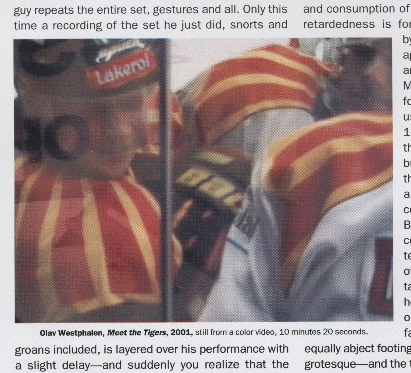 Instead, Westphalen sees these terms as formalized aesthetic codes, fully integrated into the language of contemporary art and thus in need not simply of deployment but careful study. Meet the Tigers, 2001, a video in which Westphalen suits up to play with a professional Swedish ice hockey team, is less an actual replay of abject skill-lessness and the rough- hewn, untrained aesthetic that has emerged as a dominant strain of American art in the ’90s than a catalogue of such displays of artlessness. Westphalen is here exploring the language and representation of exteriority rather than performing any authentic dumbness, stupidity, or weirdness. Westphalen dons his hockey gear, is toyed with in a warm-up scrimmage, and gets brutally checked; when he plays goalie, we see him barraged with pucks until he takes one in the mouth and is “forced to swallow it.” But all this can only be an image of pathos, suggests Westphalen: The artist qua artist can never be pathetic by performing pathos. That takes a further turn of the screw.