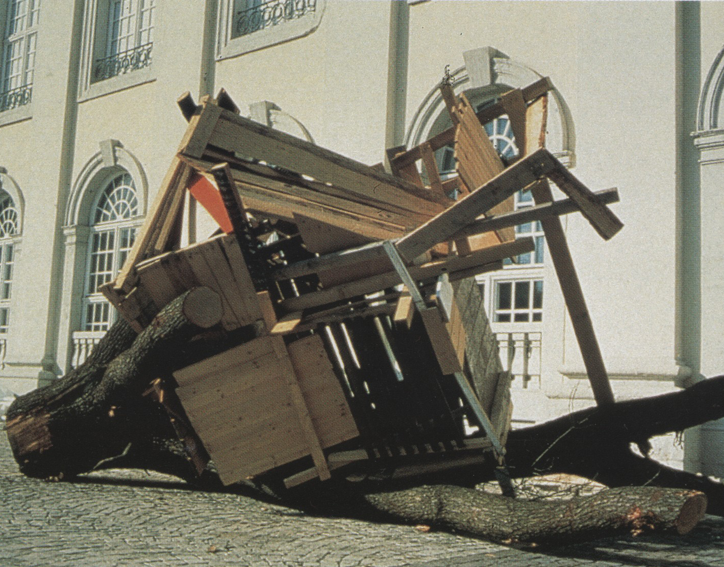 Tree House, 1996, built by a group of volunteers In a forest outside Kassel, Germany, then laid—tree and all—in front of the Fridericianum, the birthplace of Documenta and a mecca of social sculpture, gives a new twist to the term platform, so central to Documenta11’s claim to stepping outside the authorized zones of aesthetic presentation and consumption. A trope of childhood autonomy, the tree house nevertheless signals an autonomy wholly sanctioned by parental authority. Westphalen’s mode of caricature never merely mocks; It always presents an insight into Its object.