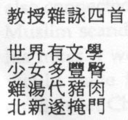 In his afterward Kubin speaks disparagingly of the earlier German renderings, especially those by East German scholar Johanna Herzfeldt (in Kubin's vol. VI, Das trunkene Land, pp. 172-173), some of which were made from the original Chinese. Yet it is difficult, and perhaps undesirable, for translation to avoid recreation, and the examples he cites in her work are not without their more recent parallels. Nevertheless, I like Kubin's renderings of Yecao ("Unkraut-Prosagedichte" [Weeds-prose poetry] also in Das trunkene Land) and a number of the classical-style poems. There are problems with the early wenyan essays, however, and I hate to admit this because I tried at one point to help the translators with some of these. For instance, the style of the German version of the lengthy 1907 piece Mofuo shi li shuo ("Uber die Macht der damonischen Poesie" / On the power of demonic poetry), which Nanjing University professor Zhao Ruihong once said marked the beginning of Chinese studies in comparative literature, is far too convoluted.6 I suspect this is due to the translator's well-placed desire to remain "true" to the original, but wasn't da ("to convey the meaning") the second of Yan Fu's principles that came before ya ("elegance")? And if the meaning is not conveyed, how can we even begin to speak of the first principle xin ("fidelity" or "loyalty" to the original). Of course, these are ultimately philosophical conundrums, but there is a need to find some middle ground for the whole enterprise of literary translation to work. Yes, Johanna Herzfeldt made some mistakes a la Florence Ayscough by reading too much into the Chinese by focusing on certain single characters that do not convey the main meaning of the baihua (vernacular) terms in which they occur (again see Kubin's afterword in vol. VI) or by taking things to an extreme by interpreting them too literally, but at least her German reads well while she is being creative.
